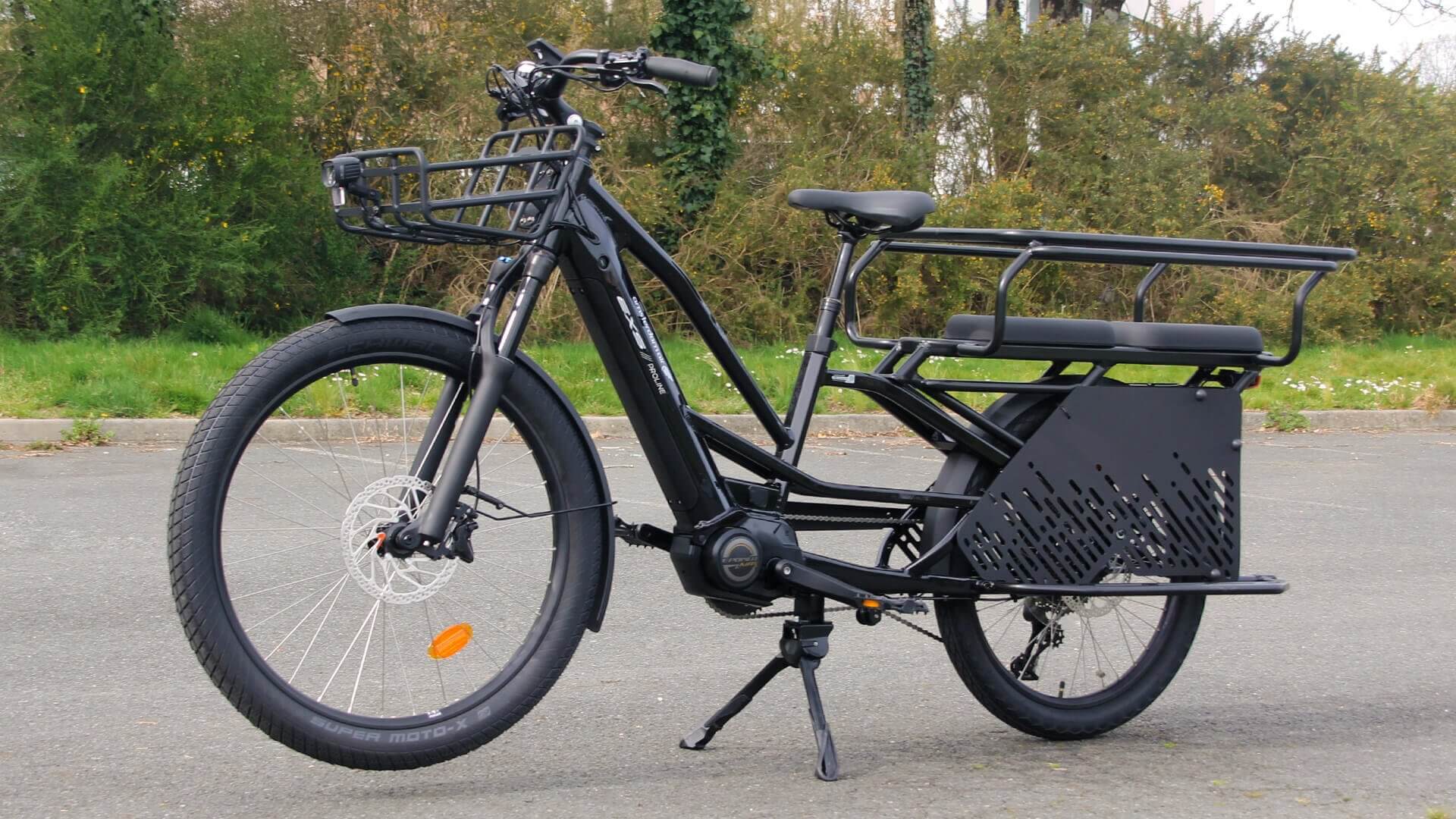 ➡️ Un vélo cargo avec un cadre allongé et un long porte-bagages arrière intégré