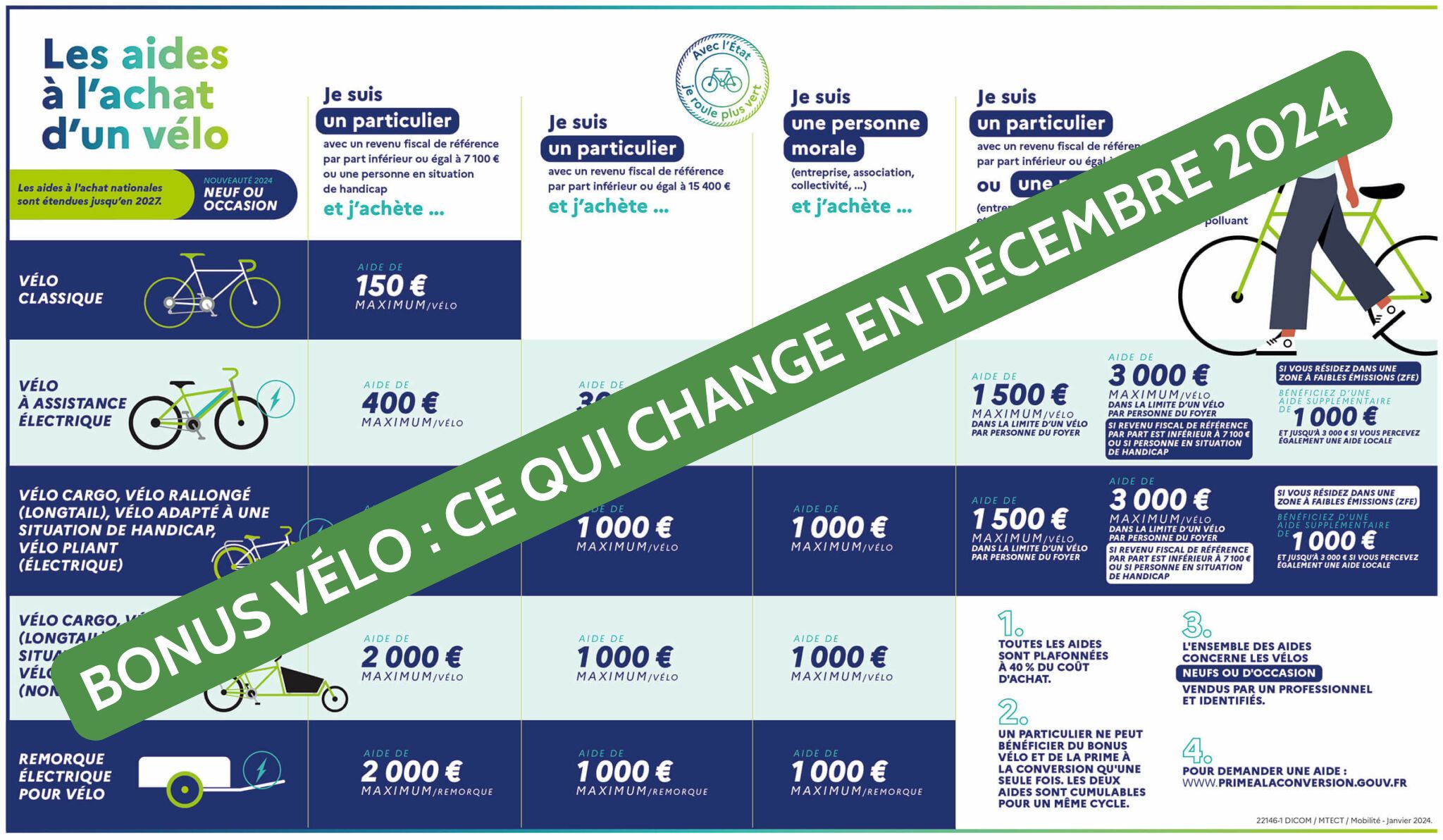 Les vélos neufs ou d’occasion, achetés ou loués, pourront encore profiter de ces aides, à condition que la facture soit datée au plus tard du 14 février 2025. En d’autres termes, vous avez encore quelques semaines pour profiter de cette aide avant sa suppression. Pour tout savoir sur les conditions d’obtention et les démarches à suivre, rendez-vous sur notre article de blog Fin du Bonus Vélo de l’État : tout ce qu’il faut savoir.