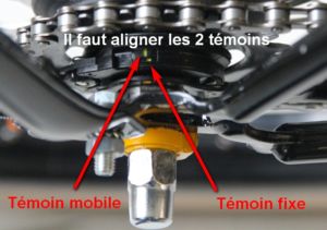 À droite du moyeu arrière apparaissent deux petites barres rouges ou jaunes, l’une fixe et l’autre mobile. Tirez vers l’avant la molette située à l’avant du sélecteur, puis vissez ou dévissez afin de déplacer la barre de couleur mobile pour qu’elle soit alignée avec la barre fixe.