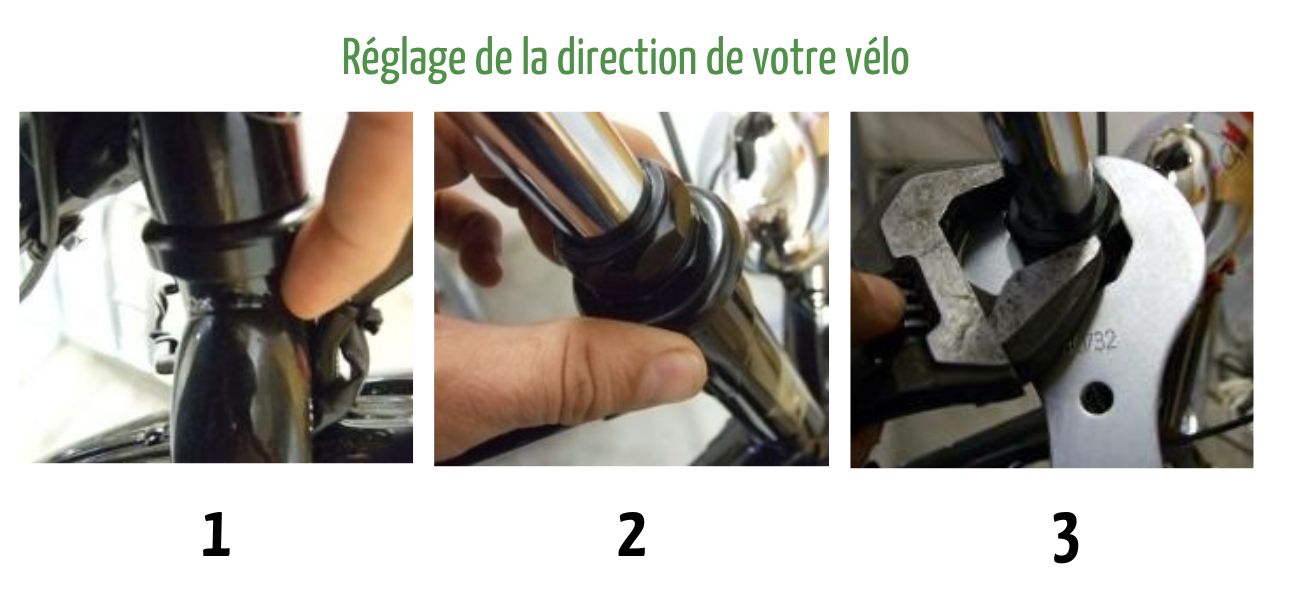 - Vous avez l’impression qu’il y a un peu de jeu dans la direction de votre vélo hollandais ? Il existe un bon moyen pour en faire une certitude. Posez un doigt entre le tube de direction et la fourche (voir photo ci-dessous pour le positionnement du doigt), puis faites avancer et reculer le vélo en maintenant la poignée du frein avant serrée. Si la fourche bouge par rapport au tube de direction, il faut régler le jeu de la direction.