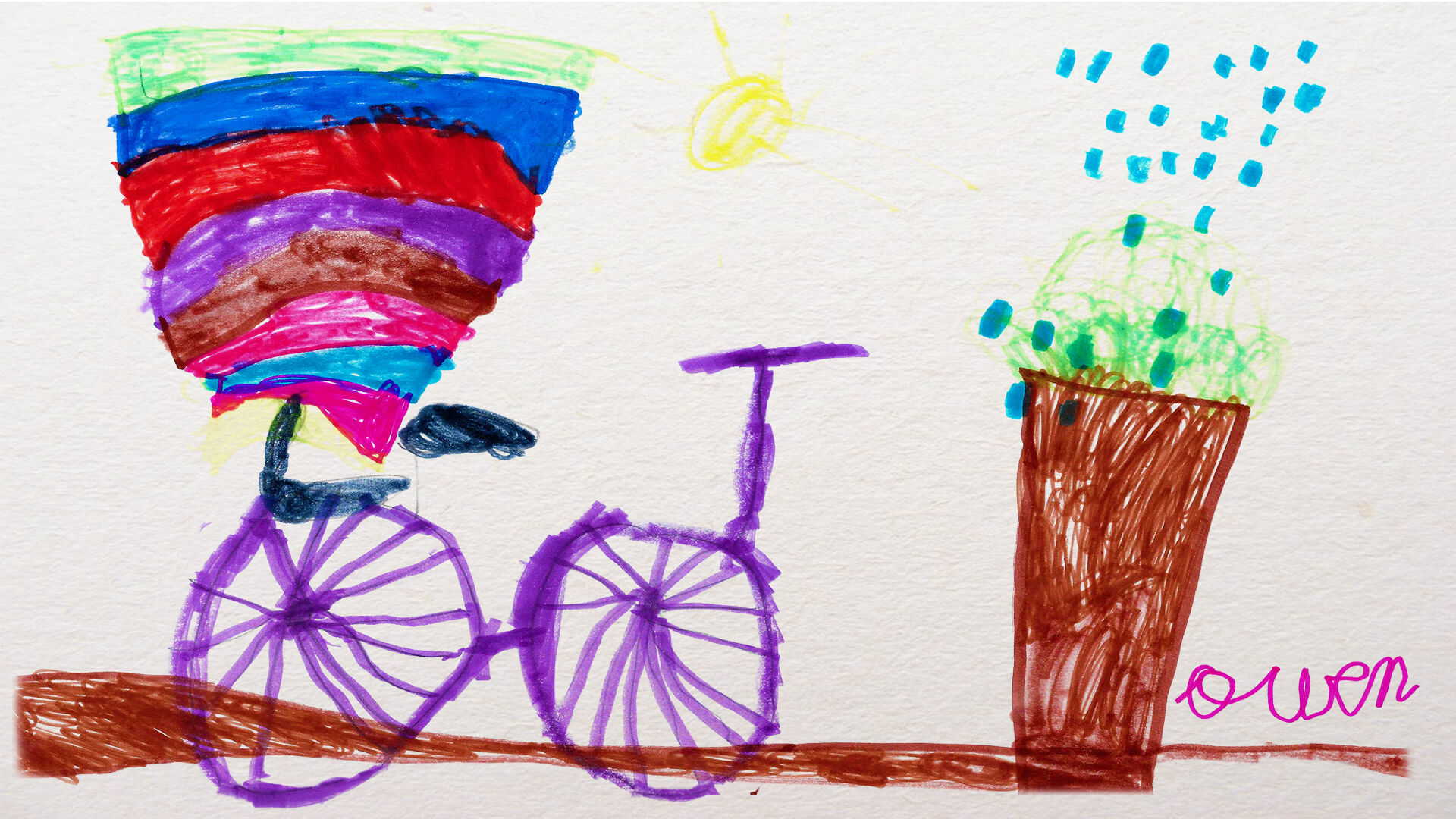 Pour pouvoir faire un.e heureux.se de plus, nous avons décidé de créer dans la foulée un prix spécial du public. Les internautes, sollicités via les réseaux sociaux ou notre newsletter, ont donc pu admirer à leur tour l’ensemble des oeuvres et voter pour le dessin de vélo qui leur avait le plus tapé dans l’oeil. C’est Kaelig, 7 ans, qui a remporté la majorité des suffrages pour ce joli tableau bucolique où l’on reconnaît parfaitement notre triporteur électrique Smiley.