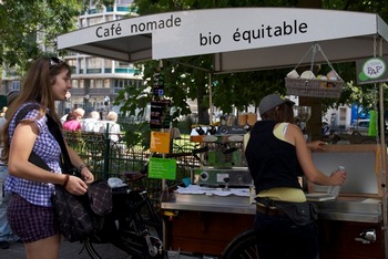 Le triporteur café de Tiffany, baptisé « L’Effet Pap' », a été conçu en collaboration avec des designers locaux. Cette création originale permet grâce à un auvent « Casquette » d’avoir une signalétique haute efficace et un abri pour les pluies fines.